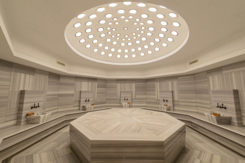 Dalla sala degli spogliatoi si passa al soğukluk, l’anticamera temperata, e poi all’hararet, la sala calda: la stanza principale con la cupola, il vapore e il calore umido che si aggirano intorno ai 40-45°C. Si entra e ci si distende sul göbek taşı centrale per la fase di sudorazione, che dura generalmente 15-20 minuti. È la fase più passiva: ci si lascia andare al calore, si respira lentamente, si osserva la luce che scende dalle aperture stellate nella cupola.